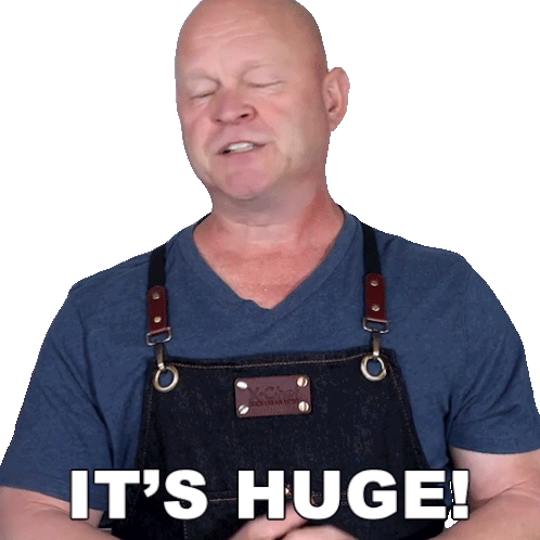 Michael Hultquist, wearing an apron, emphatically declares 'IT'S HUGE!' with expressive hand gestures.