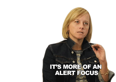 A woman with blonde hair in a denim jacket makes a focused expression, emphasizing an alert and concentrated state.