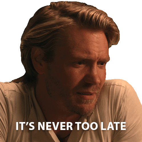 A man from 'Mother of the Bride' expresses a thoughtful sentiment with the caption 'IT'S NEVER TOO LATE'.