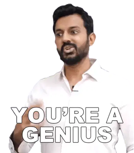 An older man in a suit and tie with glasses reacts, saying 'It's Genius!' with a knowing expression.