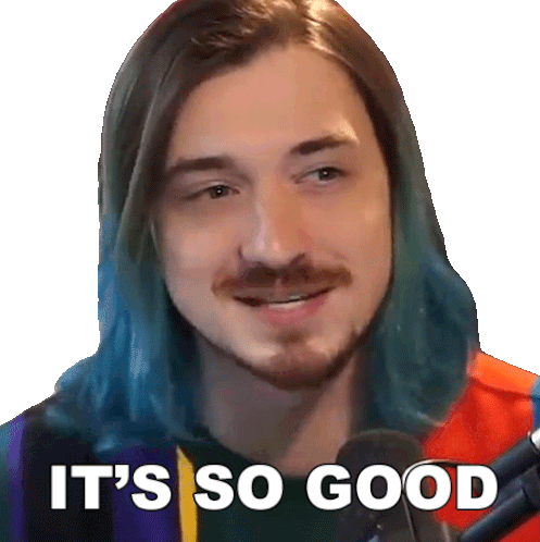 Bionicpig, a man with blue hair and a beard, smiles and says 'It's So Good' with enthusiasm.
