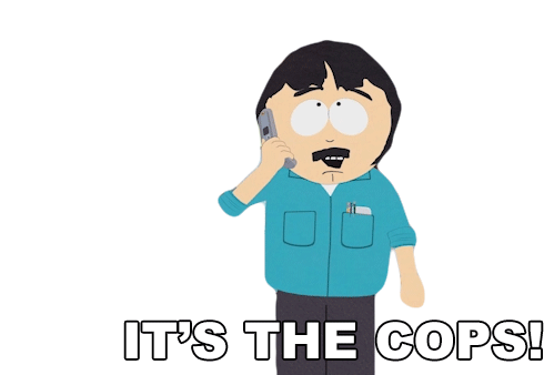 Randy Marsh from South Park on the phone, exclaiming 'It's The Cops!' in a moment of panic.
