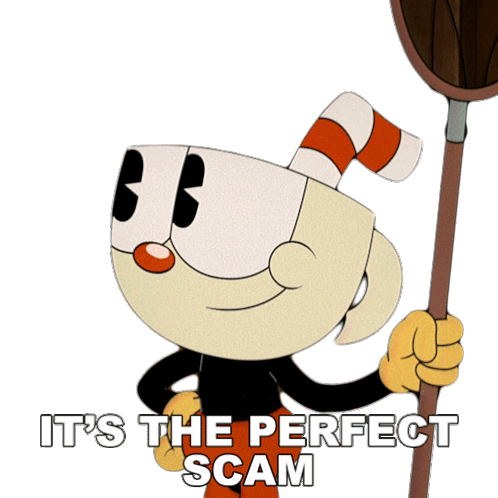 Cuphead, the mischievous character, winks and smirks while holding a net, declaring 'It's the perfect scam!'