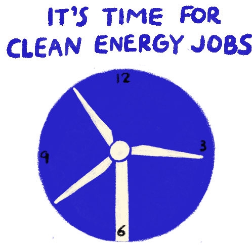A clock with wind turbine blades for hands, emphasizing "It's Time For Clean Energy Jobs".