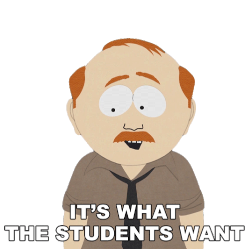 Mr. Meryl from South Park says 'It's what the students want' with a concerned expression.
