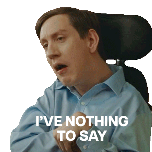Ian, a man in a wheelchair, expresses 'I've nothing to say' with a shrug and a smile, conveying a humorous lack of comment.