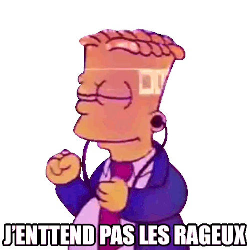 Bart Simpson, wearing earphones, dismissively states 'J'Enttend Pas Les Rageux' (I don't hear the haters) while enjoying music.