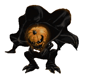 Animated pixel art monster with a glowing jack-o'-lantern head and dark, cloaked body, perfect for Halloween.