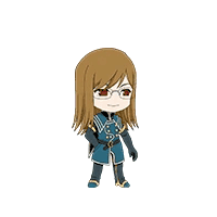Chibi-style Jade Curtiss, a character with long brown hair, glasses, and a blue uniform, smiling brightly.