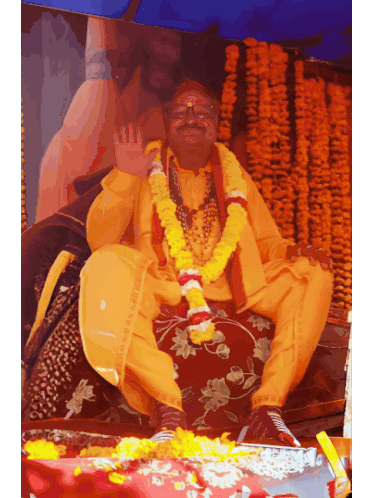 a man in a yellow robe is sitting on a couch with flowers around him