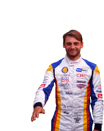 BTCC driver Jake Hill waves to the crowd, wearing his white, blue, and red racing suit with sponsor logos.