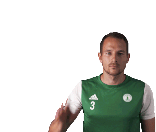 Footballer Jakub Podaný, also known as Pody, in a green jersey, looks at the camera then turns and walks away.