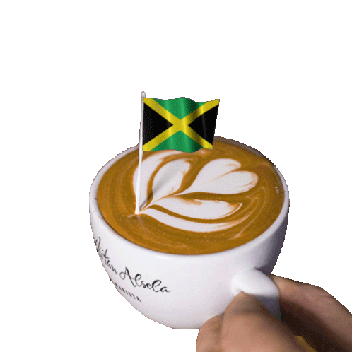 A hand holds a coffee cup with latte art and a Jamaican flag, featuring Dritan Alsela's signature.