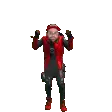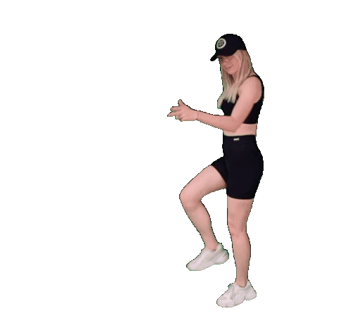 Jamal, a woman in a black sports outfit, performs an energetic dance, moving her legs and arms with a cheerful expression.