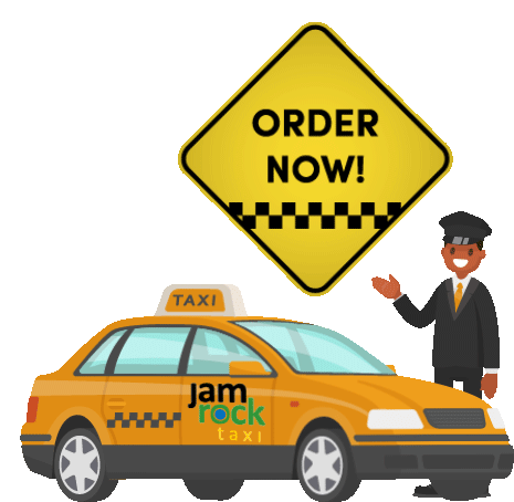 A vibrant Jamrock Taxi with a friendly driver and an 'Order Now!' sign, perfect for promoting taxi services.