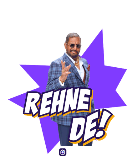 A man in a suit and sunglasses gestures with the Hindi phrase 'Rehne De!' (Let it be!) on a purple starburst background.