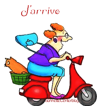 A cheerful cartoon woman rides a red scooter with a cat, signaling 'J'arrive' or 'On My Way'.