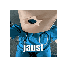 A person in a nurse's scrub and paper bag head, cosplaying as Jaunty Faust from Guilty Gear, with 'jaust' on their chest.