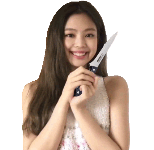 a woman is holding a knife with a sticker that says ' stainless steel ' on it