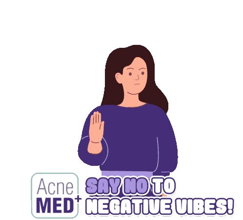 Acnemed sticker featuring an animated woman saying 'SAY NO TO NEGATIVE VIBES!' with a stop gesture.