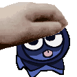 A cute pixel art animation of a hand gently petting the head of the character Jevin, a small, round creature.