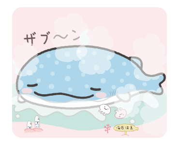 Jinbesan the whale and two small friends enjoy a relaxing soak in an underwater hot spring, with bubbles and splashes.