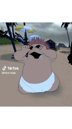 a cartoon character in a diaper is sitting on a beach with an umbrella in the background .