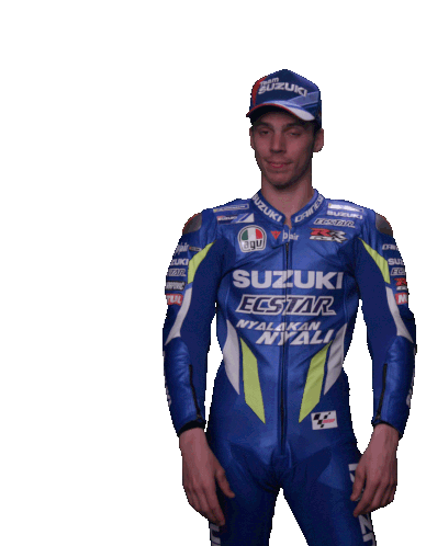MotoGP rider Joan Mir reacts with a surprised expression, hands raised to his face, wearing his Suzuki Ecstar racing suit.