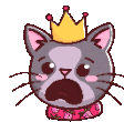 Joey Gundy's cat, Cleo, wearing a crown and pink scarf, looks stunned. A charming and expressive sticker for Twitch.