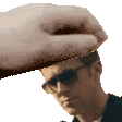 Johann, wearing sunglasses and a hat, reacts with a surprised expression as a hand touches his face.