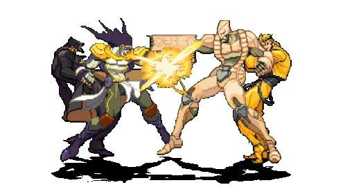 a group of cartoon characters are fighting each other and one of them has the letter p on their chest