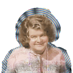 a woman with a rainbow in the background and a pink shirt