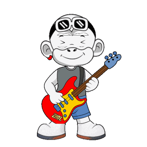 a cartoon character is holding a red guitar with the word zhot on the neck