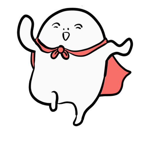 A cheerful white blob character with a red cape laughs joyfully, arms outstretched in excitement.