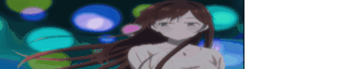 An anime girl with beautiful long hair stands against a blurry, colorful background resembling a Milky Way circle.