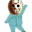 Jsonson Jammies character wearing a Jason Voorhees mask and blue pajamas, doing a funny dance.