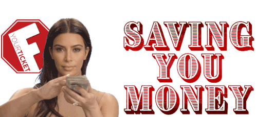 Kim Kardashian holding a stack of money with 'Saving You Money' text, promoting financial savings.