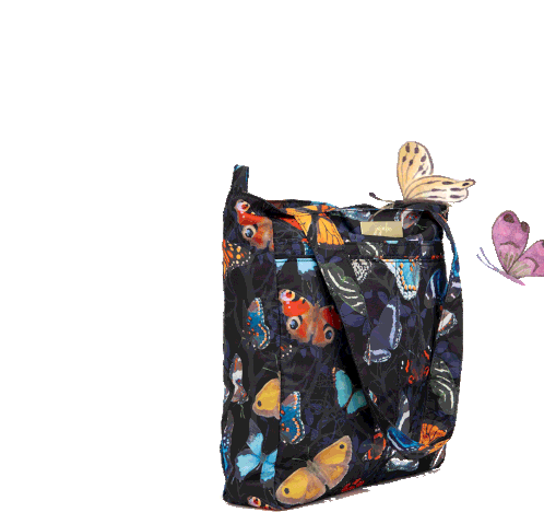 A vibrant Jujube Diaper Bag adorned with a colorful butterfly pattern, featuring two animated butterflies flying around it.