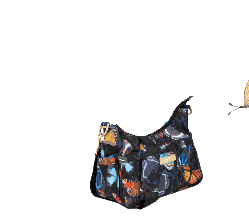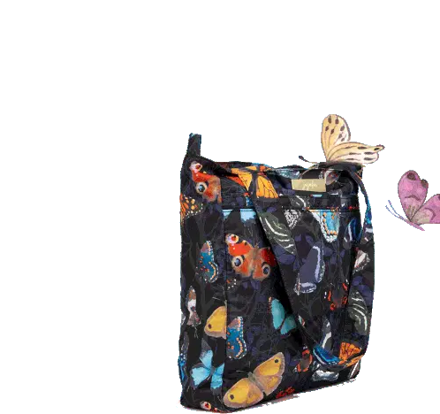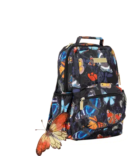 A stylish Jujube Diaper Bag in black with a vibrant butterfly pattern, featuring a fluttering Social Butterfly charm.