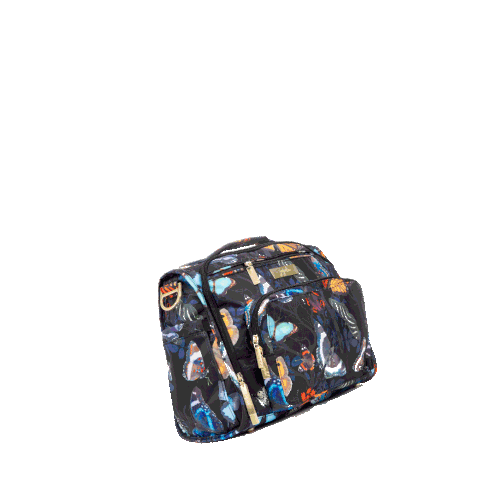 A vibrant Jujube Mini Bff diaper bag, open and packed with baby essentials, including toys, clothes, and a passport, adorned with butterflies.