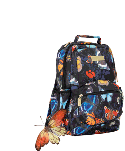 A cute Jujube Social Butterfly dog character walks with a backpack, ready for an adventure.