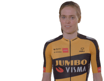 Cyclist Julie Van De Velde in her Jumbo Visma jersey smiles, points down, and claps enthusiastically.