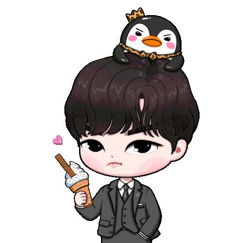 Chibi Lee Junho, from 2PM and King the Land, with a cute penguin on his head, holding an ice cream cone.