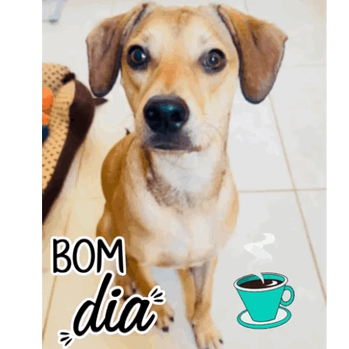 Junim, a cute brown dog, wishes 'Bom Dia' (Good Morning) with a coffee cup icon.