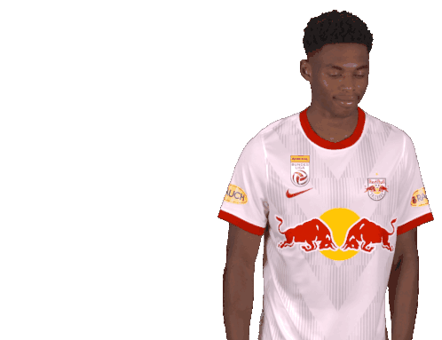Junior Adamu, wearing his Red Bull Salzburg jersey, makes a 'here you are' gesture with both hands, looking directly at the camera.