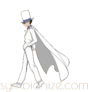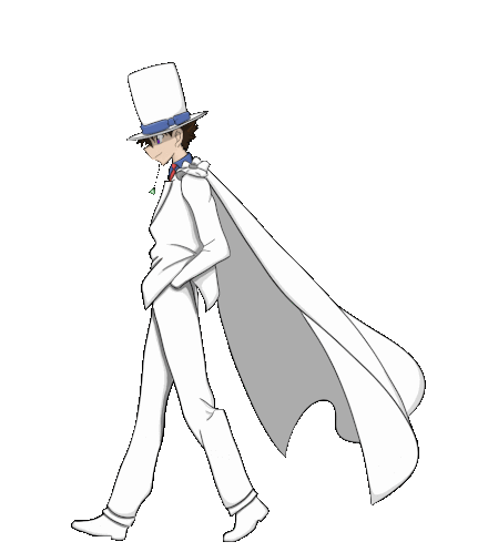 Kaito Kid from Magic Kaito walks confidently in his signature white suit and top hat, cape flowing behind him.