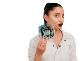 Elle holds up a container of kale chips, sporting messy dark makeup around her mouth, creating a weird and humorous expression.