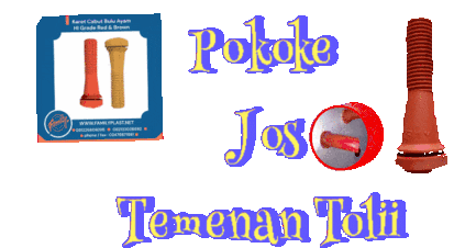 Animated sticker showcasing 'Karet Cabut Bulu Ayam' (chicken feather plucking rubber fingers) with text 'Pokoke Jos Temenan Tolii'.