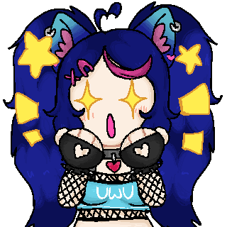Katiekatyo, the blue-haired Vtuber catgirl, shows an excited and surprised expression in this vibrant pixel art sticker.