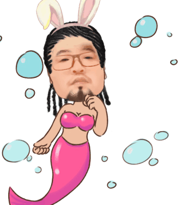 Kevin Rillom is depicted as a whimsical mermaid with bunny ears, blowing a pink heart bubble.